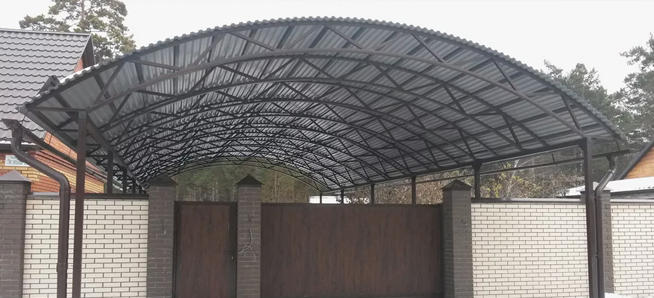 - Арочная. Производство и монтаж этих навесов требуют больше усилий. Верхние части каркаса имеют изогнутую форму, на которую затем устанавливаются профильные листы.